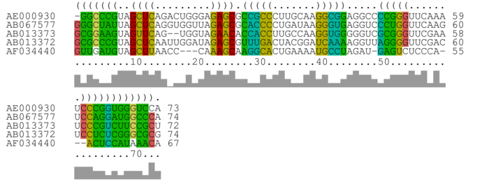 The purpose of this exampe of 5 tRNAs is to demonstrate CARNA's ability to align RNA without special properties like pseudoknots or multiple conserved structures based on their structure ensemble. Furthermore, it demonstrates the visualization of the alignment by a well known example. The visualization with conservation dot plots provides additional information over the output of general-purpose RNA alignment tools like LocARNA.