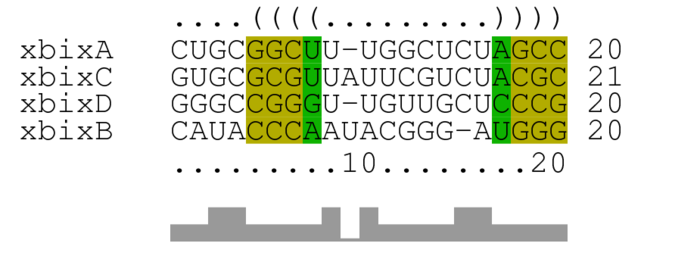 Multiple Conserved Structures Conservation dot plots for xbix variants A-D, the consensus conservation dot plot of CARNA's alignment and the consensus conservation dot plot of the alignment by LocARNA. The LocARNA consensus dot plot shows a misalignment of the inner stem of one of the two conserved structures. Only CARNA can simultaneously align both structures and aligns this stem and all other base pairs correctly. The misalignment by LocARNA is also seen by annotating LocARNA's alignment with the two conserved structures: