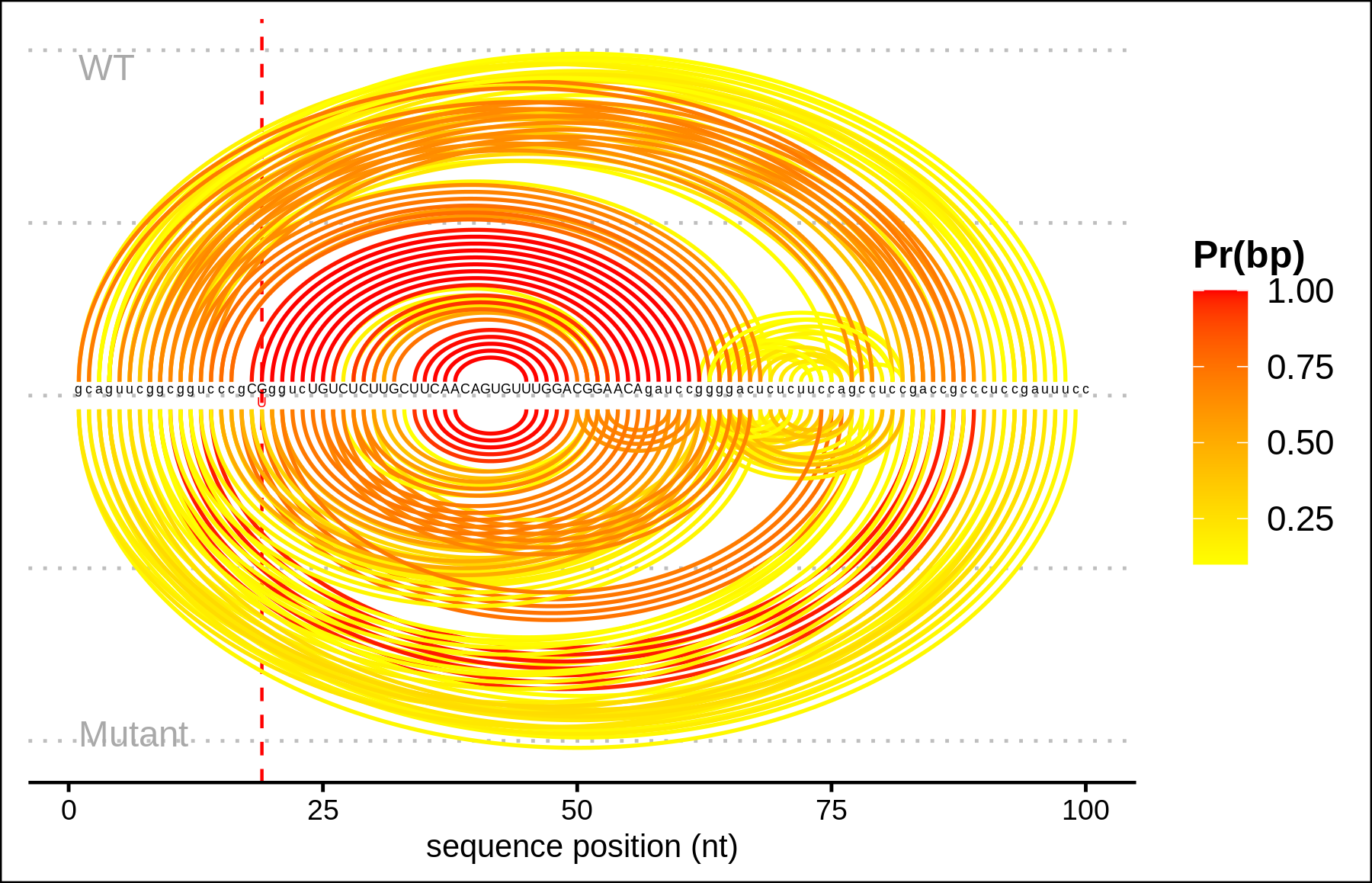 Arc plot representations (top) of the absolute change of base pairing probabilities