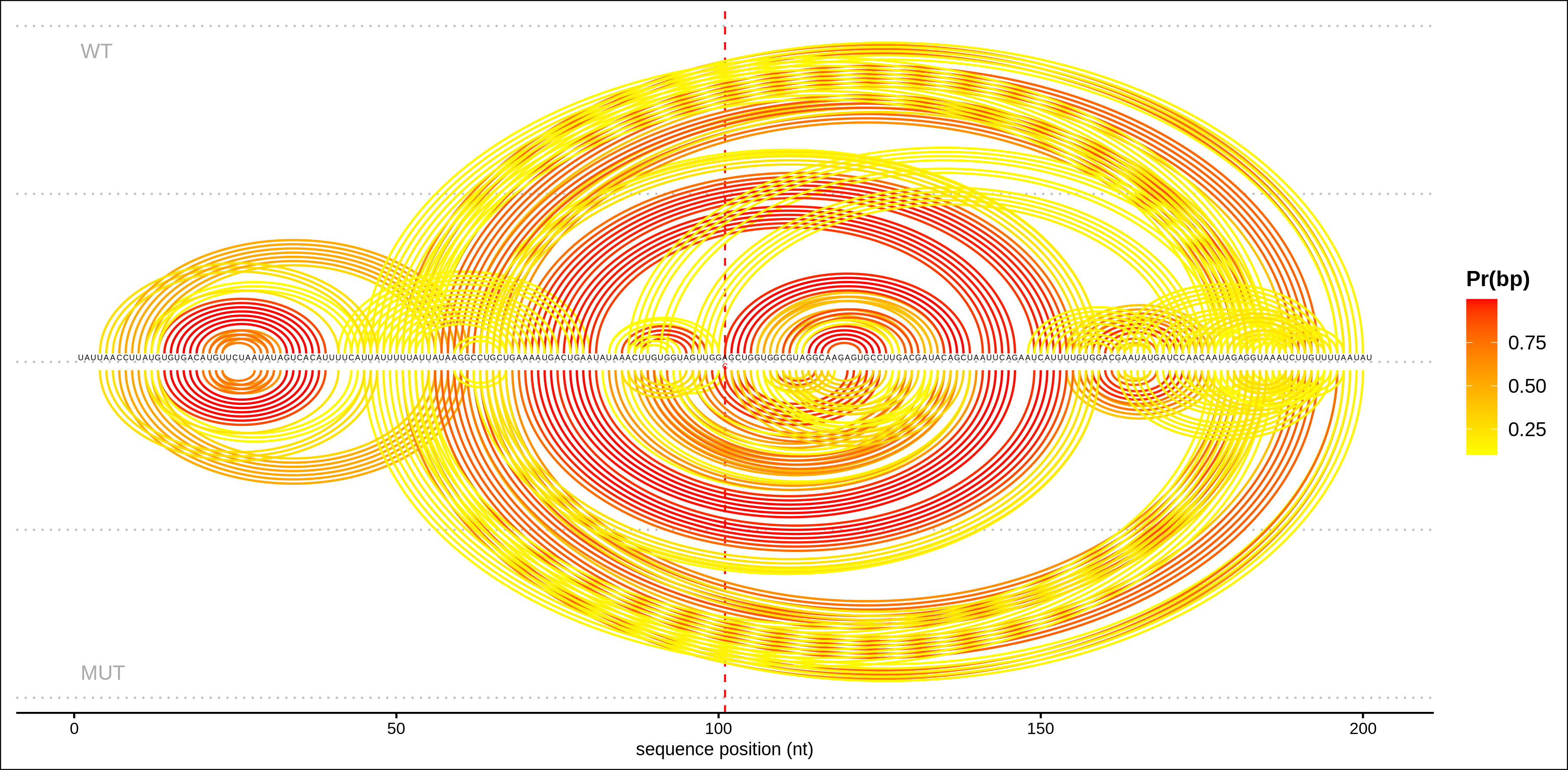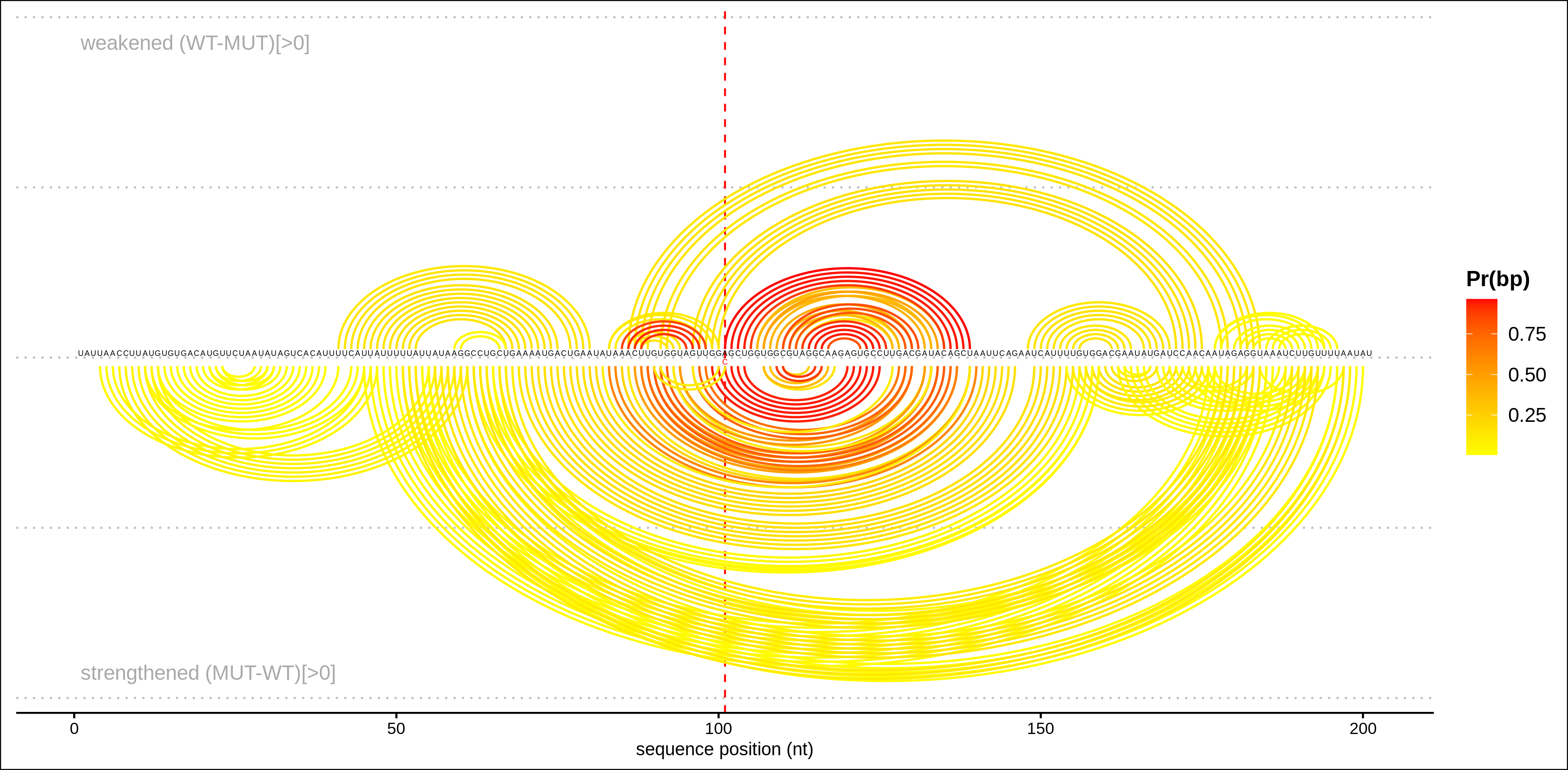 Arc plot representations (top) of the absolute change of base pairing probabilities